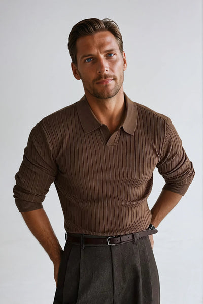 Striped Long Sleeve Polo - Brown